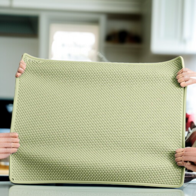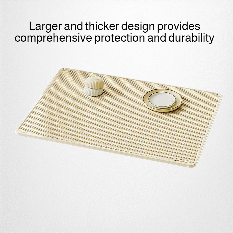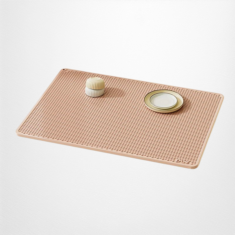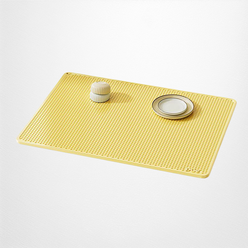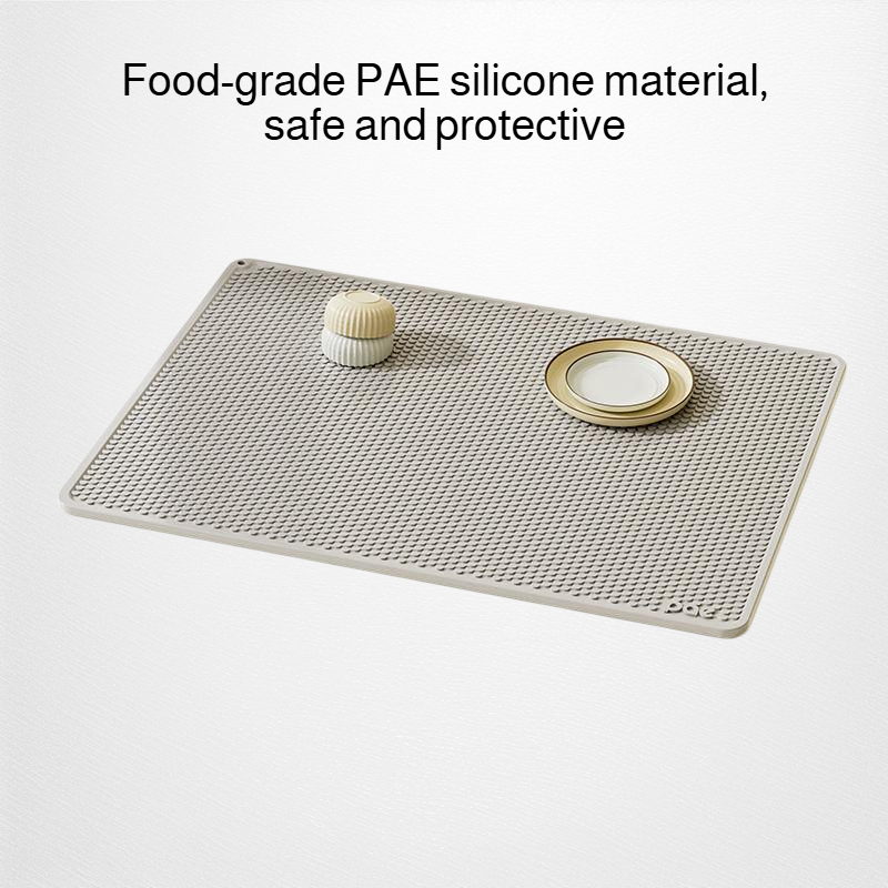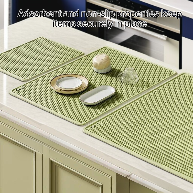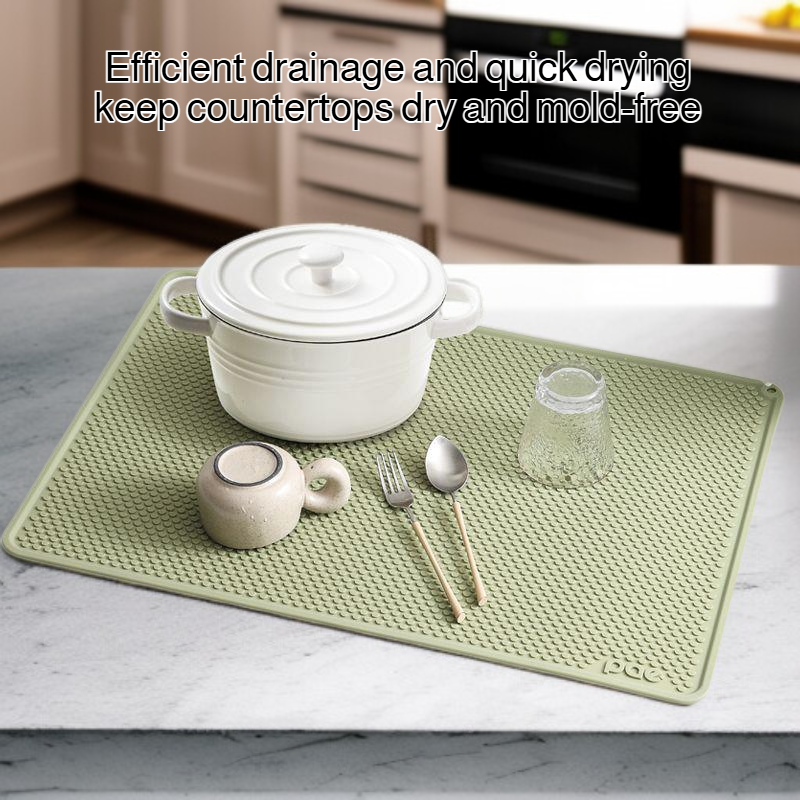 Non-slip silicone drain mat, heat-resistant, easy to clean, protects surfaces, promotes quick drying, suitable for kitchen and bathroom use.