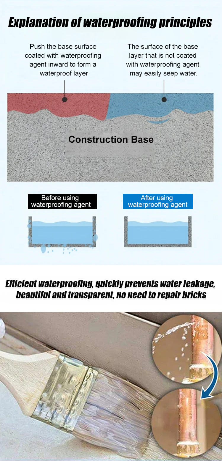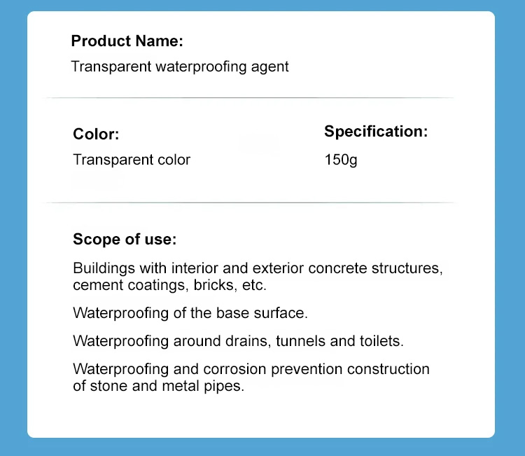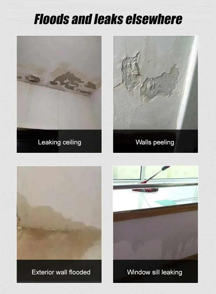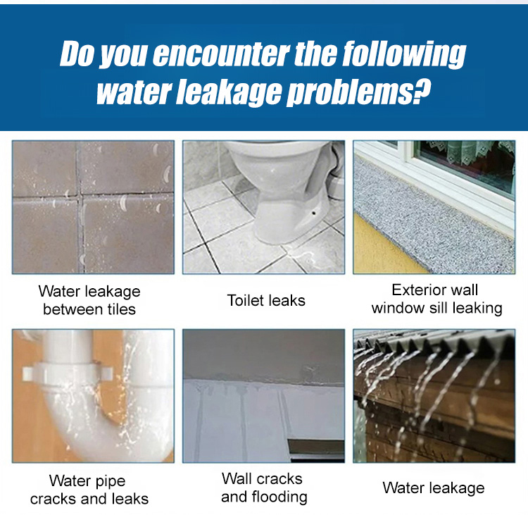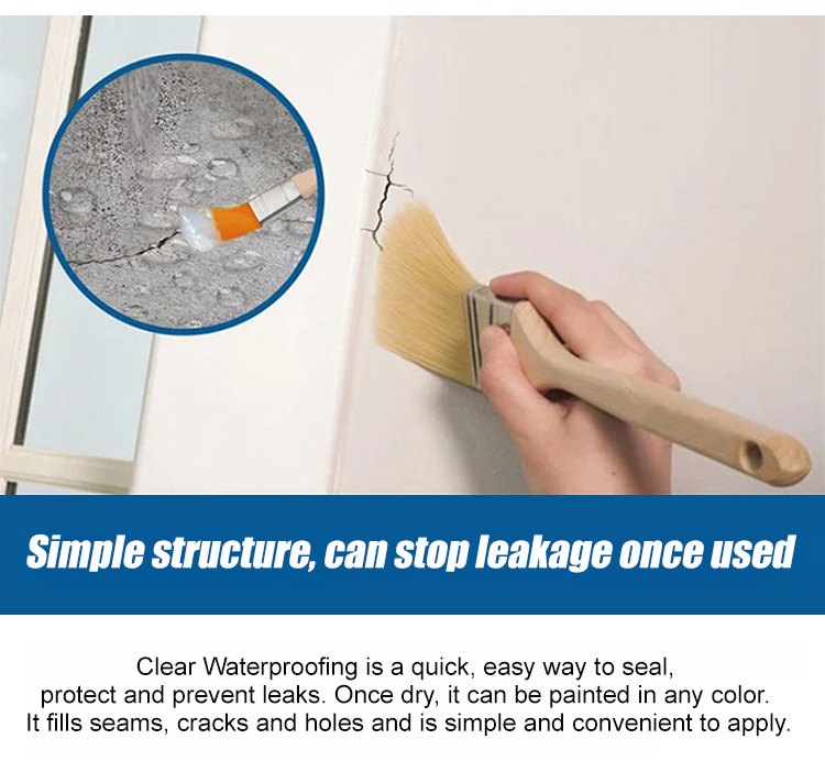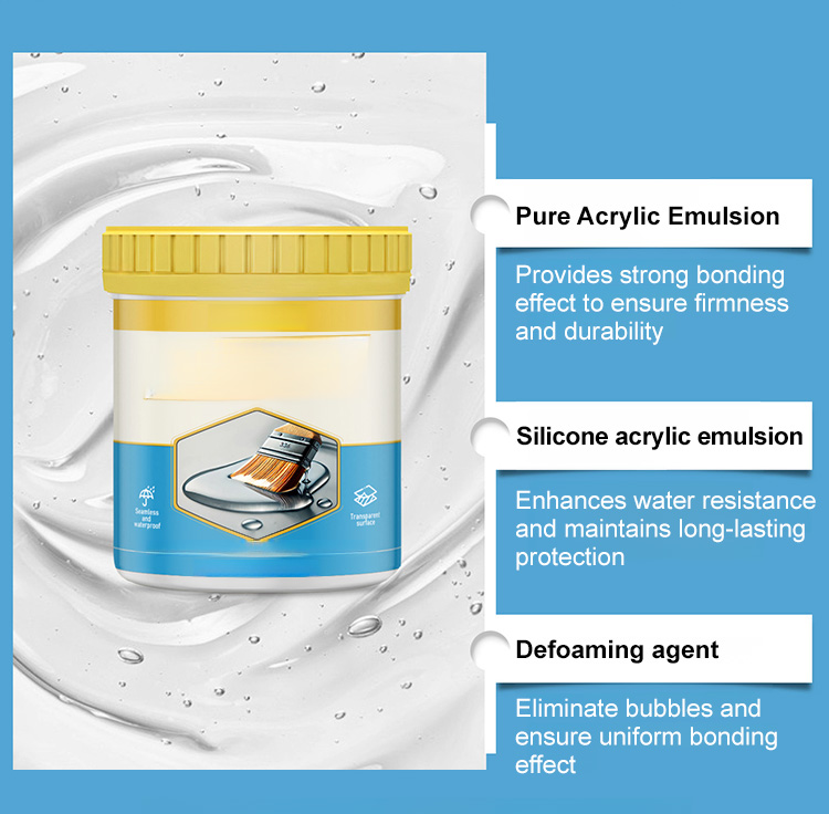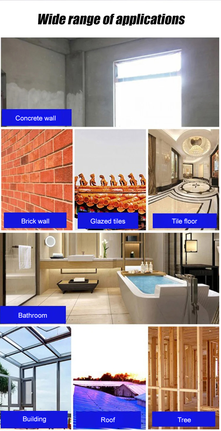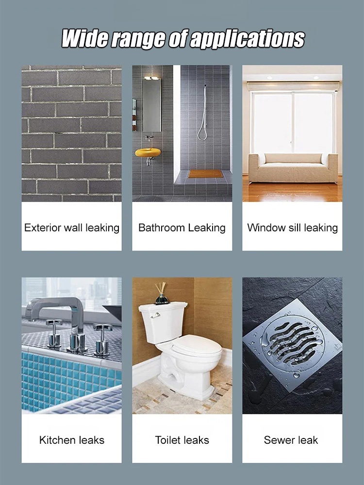 Made with imported high-polymer nano-waterproof materials, it forms an elastic rubber membrane after curing, capable of withstanding temperature differences from -50℃ to 150℃. It is resistant to sun exposure and freeze-thaw cracking, providing a firm seal for roofs, window sills, bathrooms, exterior walls, and pipe joints, preventing water seepage and leaks. With superior adhesion, it can bond to various materials such as cement, tiles, glass, metal, and wood, achieving waterproofing, leak sealing, and bonding in one step.